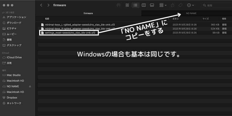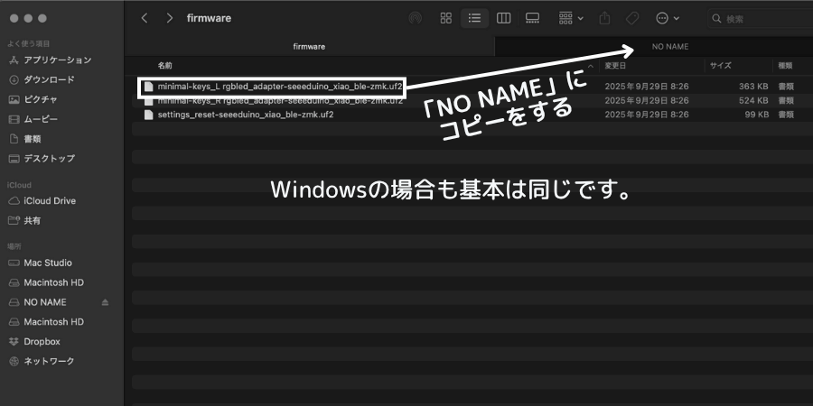 パソコンとキーボードが認識したら、ファームウェアの書き込みをします。