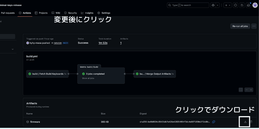 更新ボタンを押すとGitHubの画面に移動するので、画像の通りにファームウェアをクリックしてダウンロードしてください。