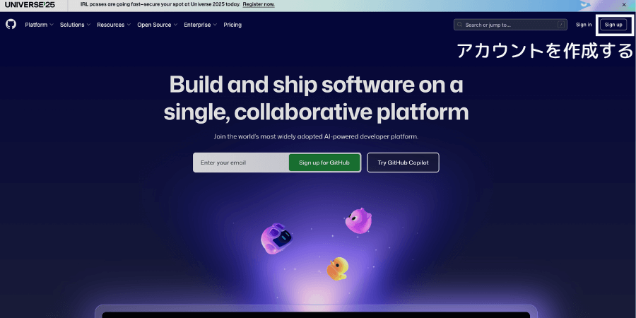 リポジトリにアクセスするには、GitHubのアカウントが必要なため、登録がまだの人はサインアップをしましょう。