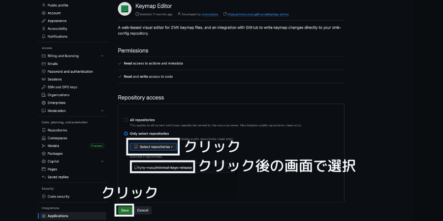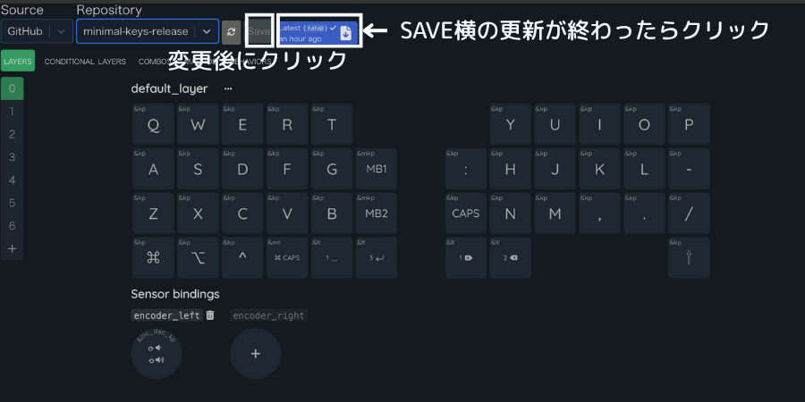 キーマップの反映は最後に保存をするとキーボードに書き込まれるので、忘れずクリックしてください。